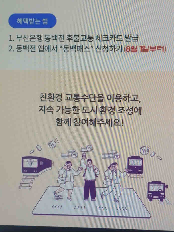 동백패스는 동백전 체크카.드 후불교통 서비스를 이용하는 부산광역시 시민으로 평소 대중교통 이용이 많은 분들이라면 누구나 신청 가능한데요.