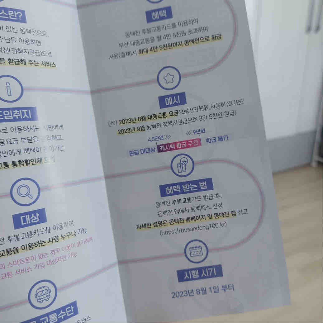 동백패스는 전국 최초로 부산에서 도입된 대중교통 통합 할인 제도인데요. 부산시에서 2023년 8월 1일 이후부터 도시철도 부산 지하철 1호선, 2호선, 3호선, 4호선, 김해 경전철, 동해남부선, 일반 시내버스, 좌석버스, 마을버스 등의 대중교통을 월 45,000원 이상 사용하면 월 최대 45,000원을 환급받을 수 있는 정책지원금입니다.