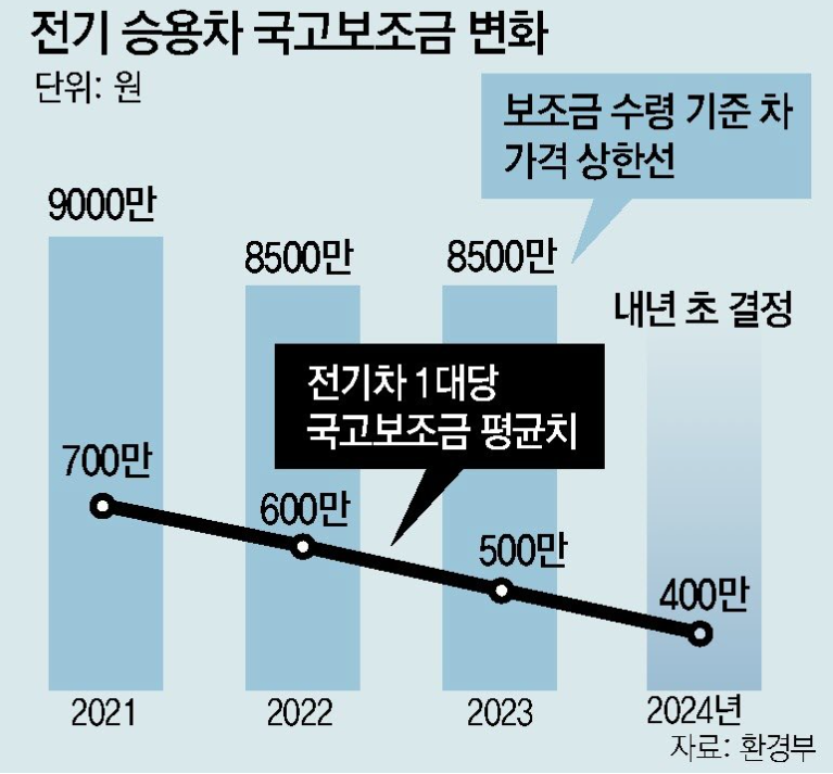 2024년의 전기차 보조금은 예산의 효율적인 배분과 시장의 자립을 장려하기 위해 조정되었어요. 최대 지급 금액이 650만 원으로 설정되었는데, 작년 대비 30만 원이나 감소한 금액이라 많이 아쉽기는 합니다. 또한, 전기차 보조금 100% 지급 대상 차량의 가격 기준이 5500만 원으로 하향되어 조금 실망스럽기는 합니다.